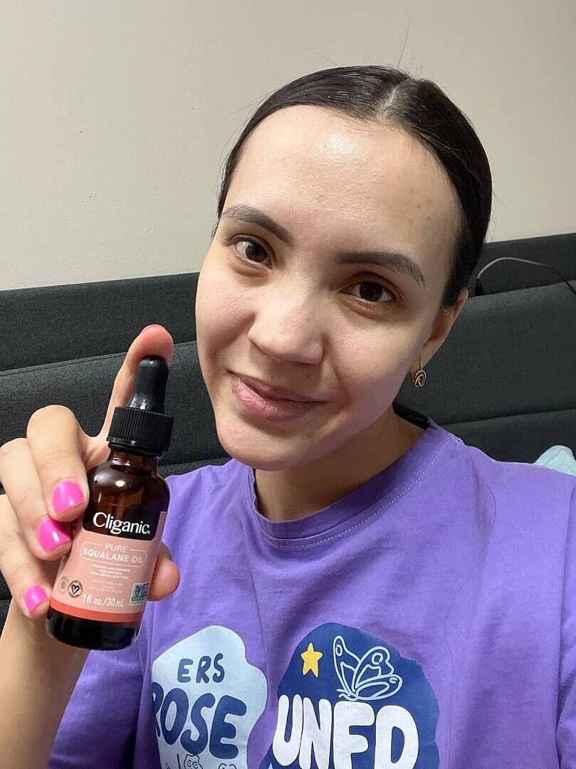 Our product is made with squalane, a type of oil that is a hydrogenated version of squalene. Squalane aims to restore some of the benefits lost during the natural aging process, such as slowing down moisture loss, promoting the look of firmer skin, and imparting a silky-soft feeling to both skin and hair.